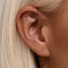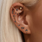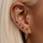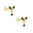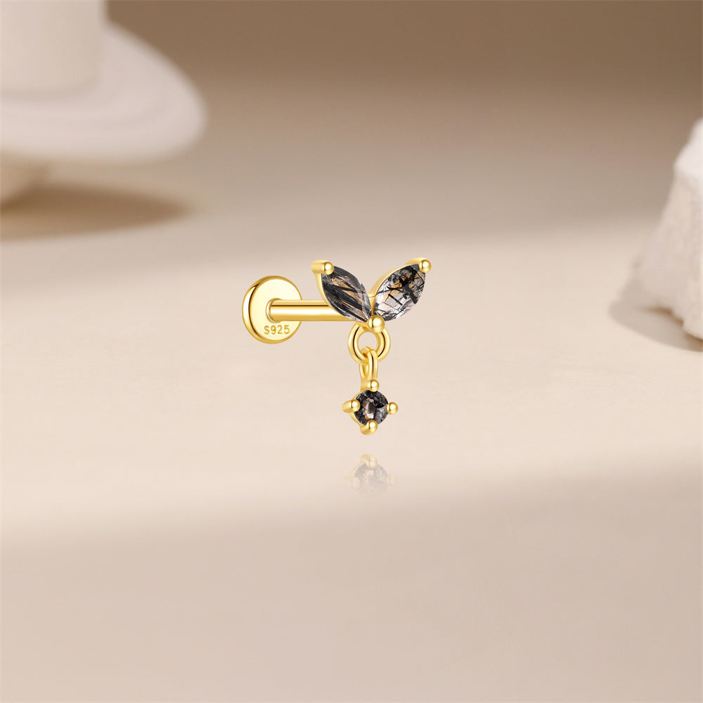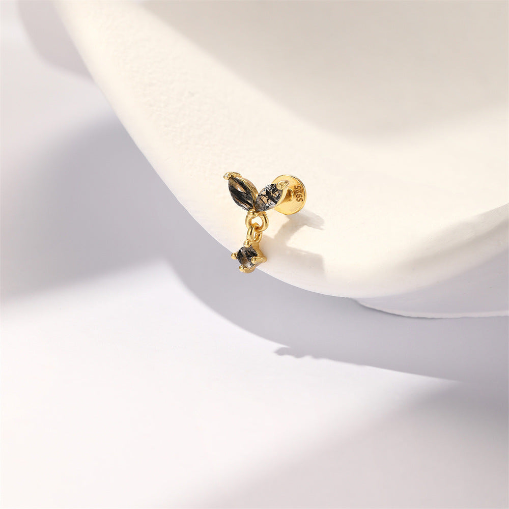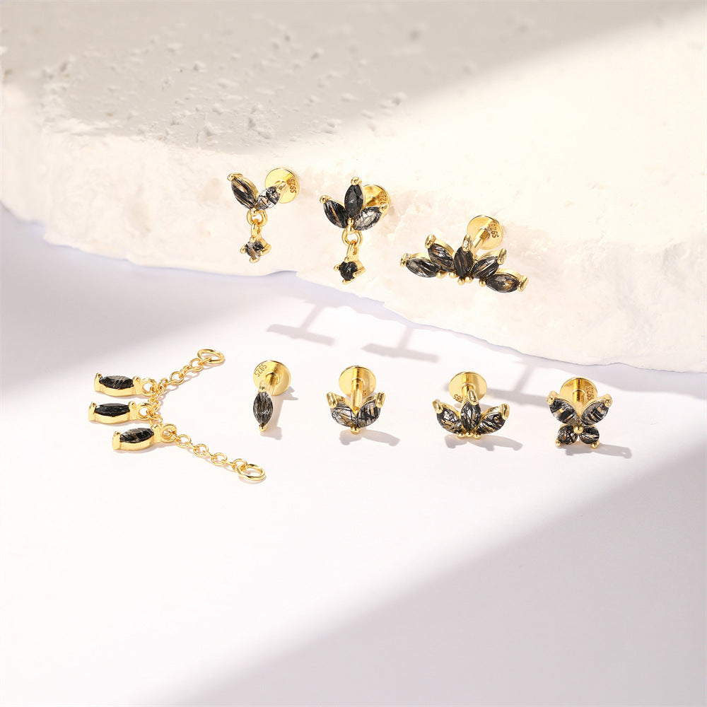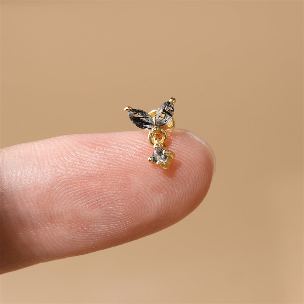 S925 Gold-Plated Butterfly-Shaped Flat Back Earrings Natural Black Hair Quartz Cartilage Studs with Chain